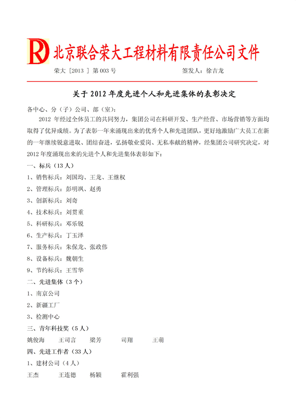 完美体育官网登录入口荣大集团2012年度先进个人和先进集体的表彰决定