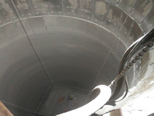 该高炉铁口和风口带侵蚀严重,炉身下部有不规则突台,我公司决定对铁口和风口带进行整体浇注,炉身采用人工喷注进行施工。