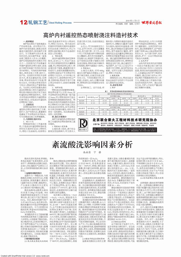 高炉是长期处于连续高温生产的冶炼设备。在长期运行中,高炉内衬受到浸蚀、剥落出现局部或大面积损坏,影响高炉正常运行。为了使高炉达到长寿、高效的目的,延长高炉寿命一直是冶炼工程技术人员关心的课题。高炉长寿是炼铁技术发展水平标志之一,目前国内已开始普遍采用高炉遥控热态喷补造衬,就是在不停炉的前提下利用休风时间对内衬喷补。原传统的停炉维修相比,其具有施工方便、耗时少、投产快的特点。但该技术采用的干法喷涂方式,其无法避免具有:回弹率高、喷涂层结构均匀性差(喷枪头加水,水料混合难均匀充分)、喷涂时粉尘严重等缺点。为此我公司将目前最先进的浇注料喷射施工技术与遥控热态喷补技术相结合,试验开发了浇注料遥控热态喷射造衬技术。该技术系采用浇注料喷射机与遥控喷涂机械手配合,实现浇注料遥控热态喷射施工造衬。