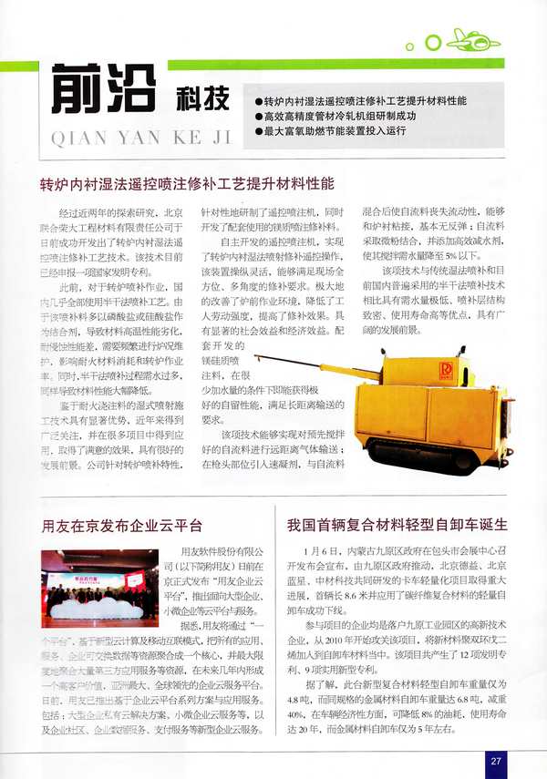 经过近两年的探索研究,北京完美体育官网登录入口荣大工程材料有限责任公司日前成功开发出了转炉内衬湿法遥控喷注修补工艺技术。该技术目前已经申报一项国家发明专利。